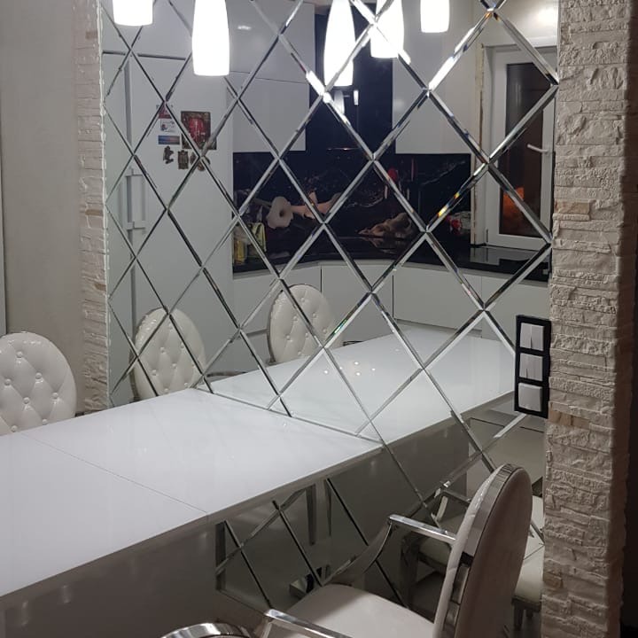 Использовалась серебристая зеркальная плитка формы "вытянутый ромб".
